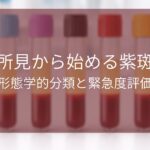 紫斑の診療では、緊急度の高い疾患を示す徴候の有無について確認しつつ、形態学的特徴から病態を推定して鑑別を進めていくことが実践的です。