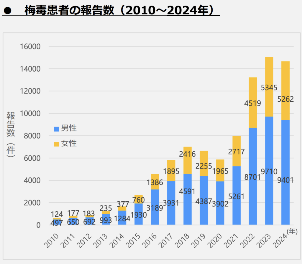 梅毒は近年増加しています。2010年には梅毒の報告数は621件でしたが、2022年以降は10000件を超えています。[1]